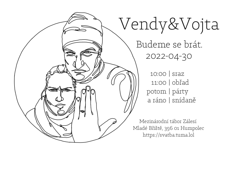 Sejdeme se na táboře v 10:00. Přivítáme se, seřadíme a v 11:00 budeme pokračovat obřadem. Na dvanáctou odjedeme s rodinou na řízek do Humpolce. Kamarádi si dají oběd v táboře a ubytují se v chatkách. Vrátíme se z Humpolce s rodinou a dortem. Sníme dort, dáme si kafe, pokecáme.